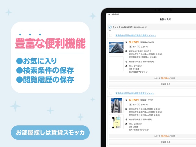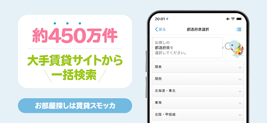約450万件の物件を持つ日本最大のデータベースから一括して賃貸住宅を検索できるサイトです。マルチデバイスコンピュータ、タブレット、スマートフォンをサポートしています。物件情報が毎日更新されているので、日本全国の新鮮さに優れた賃貸物件を簡単に見つけることができます。また、貸貸スモッカでお問い合わせいただいた客室·不動産会社と契約し、申込条件を満たした場合、入居祝いとして最大5万円のキャッシュバックが支給されます。